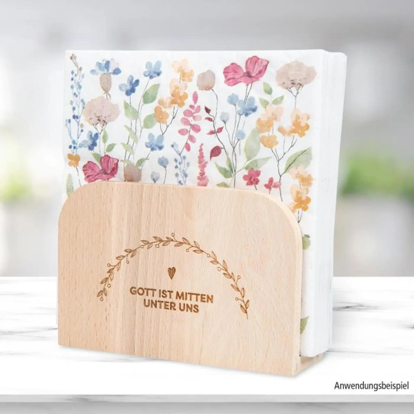 Zu alle Mahlzeiten wird der Tisch gedeckt. Dieser schöne Servietten-Ständer aus Buchenholz, veredelt mit Lasergravur "Gott ist mitten unter uns" , bleibt auf dem Tisch stehen.