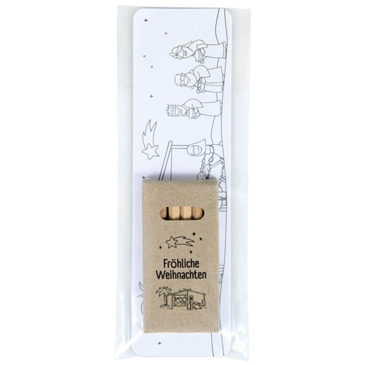 Schöne Beschäftigung für Kinder in der Weihnachtszeit oder als Dankeschön zum Krippenspiel: Set mit drei Lesezeichen zum Ausmalen und einer Schachtel mit sechs Buntstiften mit Aufdruck "Fröhliche Weihnachten". Die Lesezeichen sind beidseitig bedruckt auf stabilem Papier.