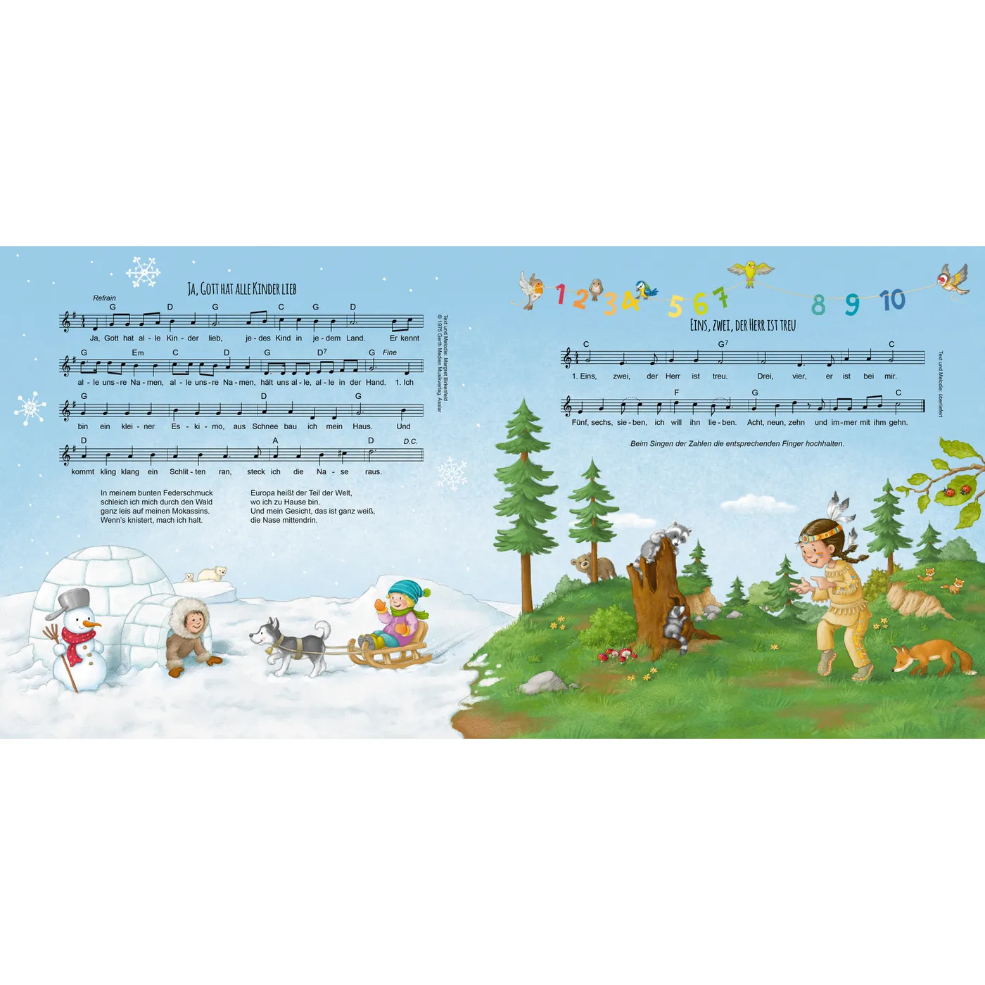 Insgesamt sind es 12 sehr bekannte Lieder, die jeder kennt so wie „Eins, zwei, der Herr ist treu“ oder „Gott mag Kinder“. Einfach und doch besonders mit eingängigen Melodien. Sollte aber doch das eine oder andere Lied nicht bekannt sein, helfen die Noten dabei, ein neues wunderschönes Lied zu lernen oder auch vergessene Liedtexte aufzufrischen. Wer möchte, kann die Lieder auch musikalisch begleiten, Noten und Gitarrengriffe sind ebenfalls abgedruckt. Und nach dem Singen kann man sich zu den Liedern und Bildern schöne Geschichten ausdenken oder aber auch ein Bildersuchspiel machen.