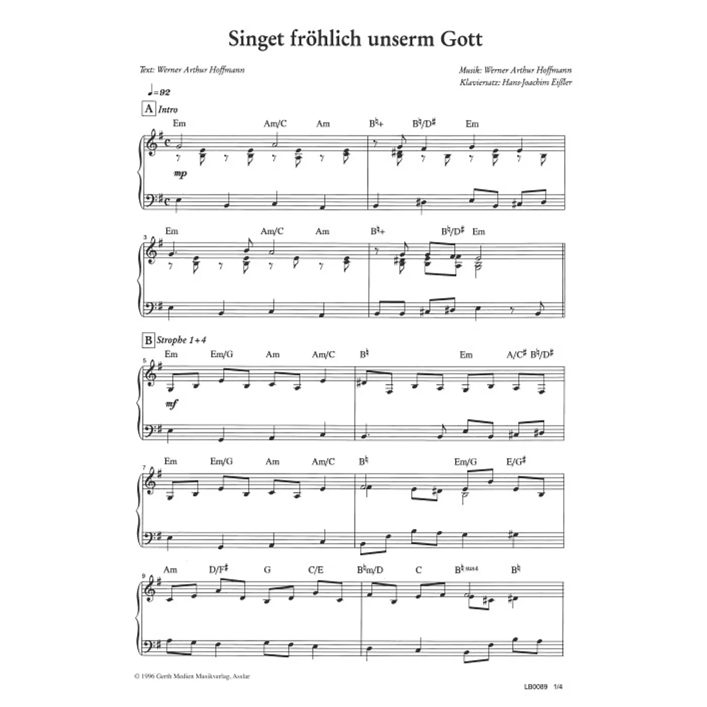Singet fröhlich unserm Gott (diese Variante haben Sie gerade ausgewählt) (modern, Klavier, Klavierpartitur, Partituren, mit Akkorden, E-Moll) Werner A. Hoffmann (Komposition, Text), Hans-Joachim Eißler (Klaviersatz) |