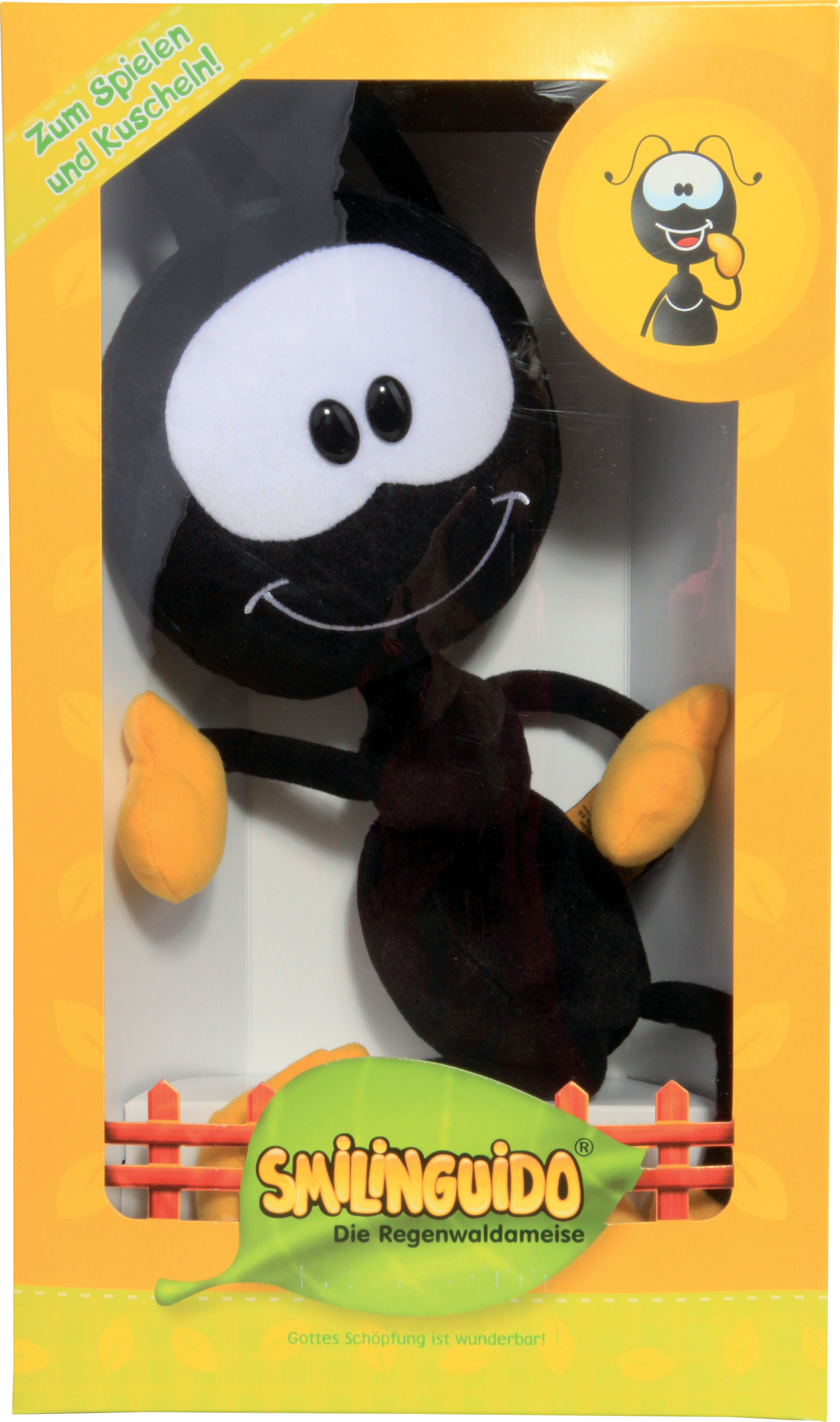 Die niedliche Ameise Smilinguido gibt es auch als Stoffpuppe zum Anfassen: weich und flauschig, zum Spielen und Kuscheln in einer wertigen Verpackung mit Sichtfenster.