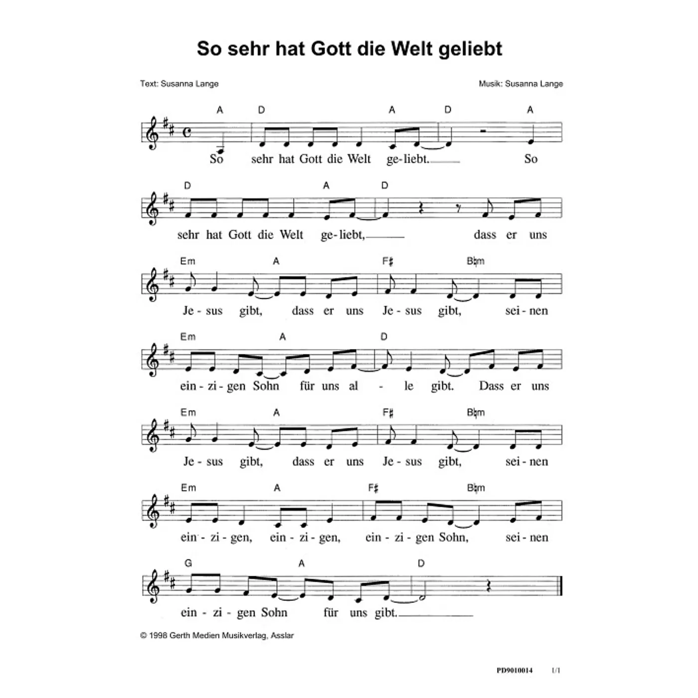 So sehr hat Gott die Welt geliebt (diese Variante haben Sie gerade ausgewählt) (einstimmig, mit Akkorden, D-Dur) Susanna Lange |