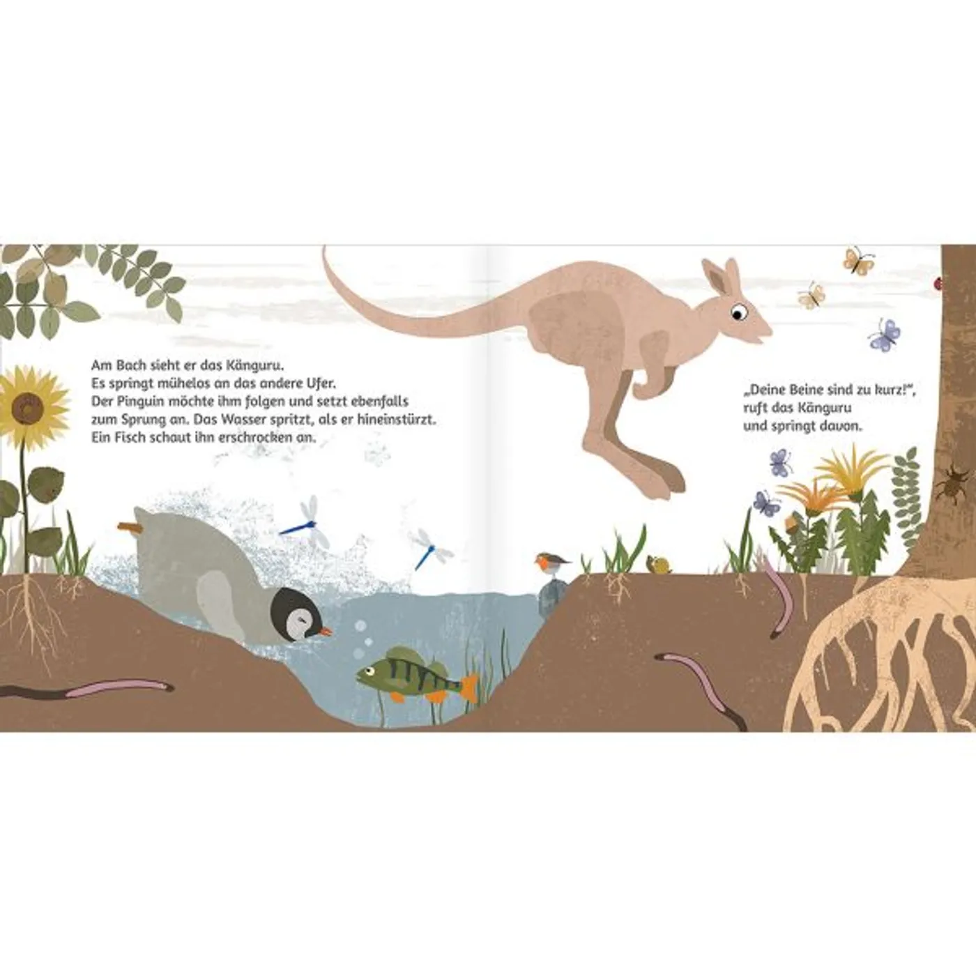 Ein kleiner Pinguin entdeckt voller Neugier die anderen Tiere seines Zoos. Dabei muss er feststellen, dass er sich mit keinem von ihnen messen kann. Traurig geht er zu seinem Schwimmbecken zurück und tut, was ihn wieder glücklich macht: Er taucht ab. Erst durch die erstaunten Gesichter der anderen Tiere, welche sich alle vor seinem Pool versammeln, wird ihm bewusst, was für ein wunderbares Talent er hat. Zufrieden erkennt er, dass es sich nicht lohnt, ständig nach den anderen zu schielen. In ihm schlummern einzigartige Fähigkeiten, die nur erkannt werden müssen. Gott hat ihn wunderbar gemacht.