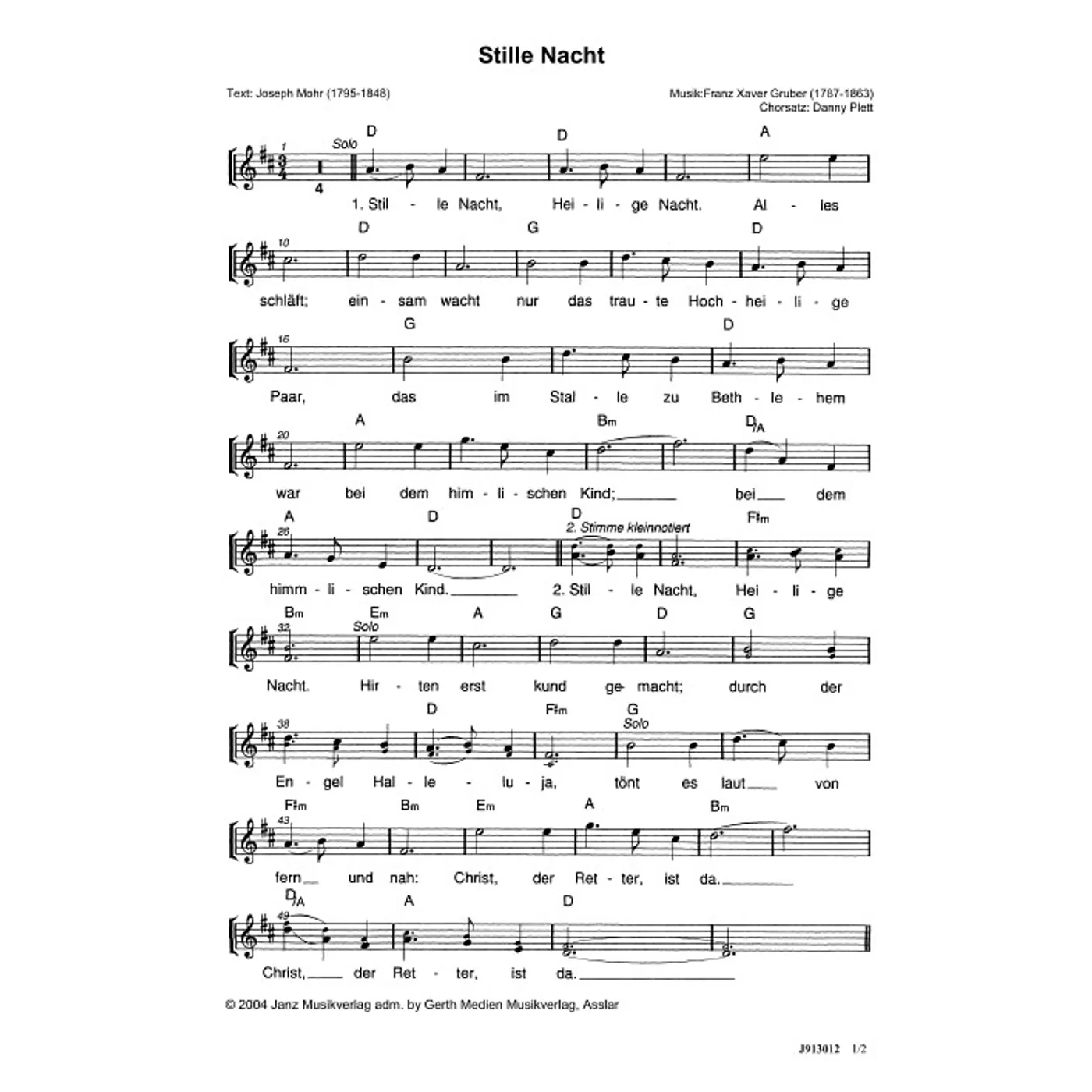 Stille Nacht, heilige Nacht (diese Variante haben Sie gerade ausgewählt) (traditionell, Backings, Solostimme, dreistimmig, mit Akkorden, D-Dur) Franz Xaver Gruber (Komposition), Joseph Mohr (Text), Danny Plett (Bearbeiter) |