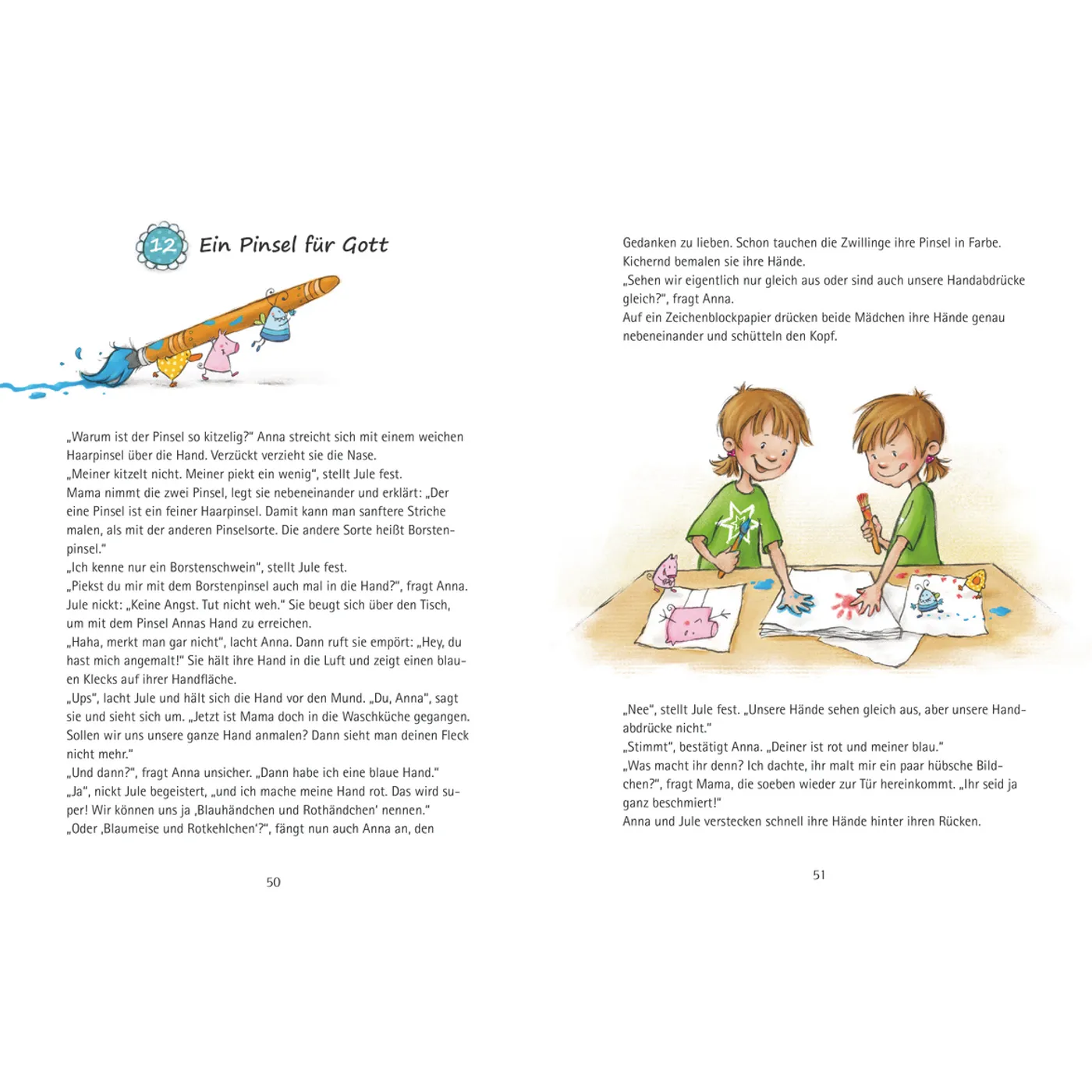 Anja und Jule sind zwei lustige Zwillingsmädchen. Wir durften die beiden in diesem Buch kennen- und liebenlernen. Die 25 Geschichten sind alle recht kurz (zwischen 4 und 7 Minuten Vorlesedauer, was auch über der jew. Überschrift angegeben ist) und mit liebevollen Illustrationen geschmückt. Der Wiedererkennungseffekt ist für Eltern und Kinder in diesem Buch sehr hoch, da die Zwillinge voller Ideen stecken, die man oftmals von den eigenen Kindern kennt, außerdem wurden authentische Alltagsgeschehnisse eingebunden.