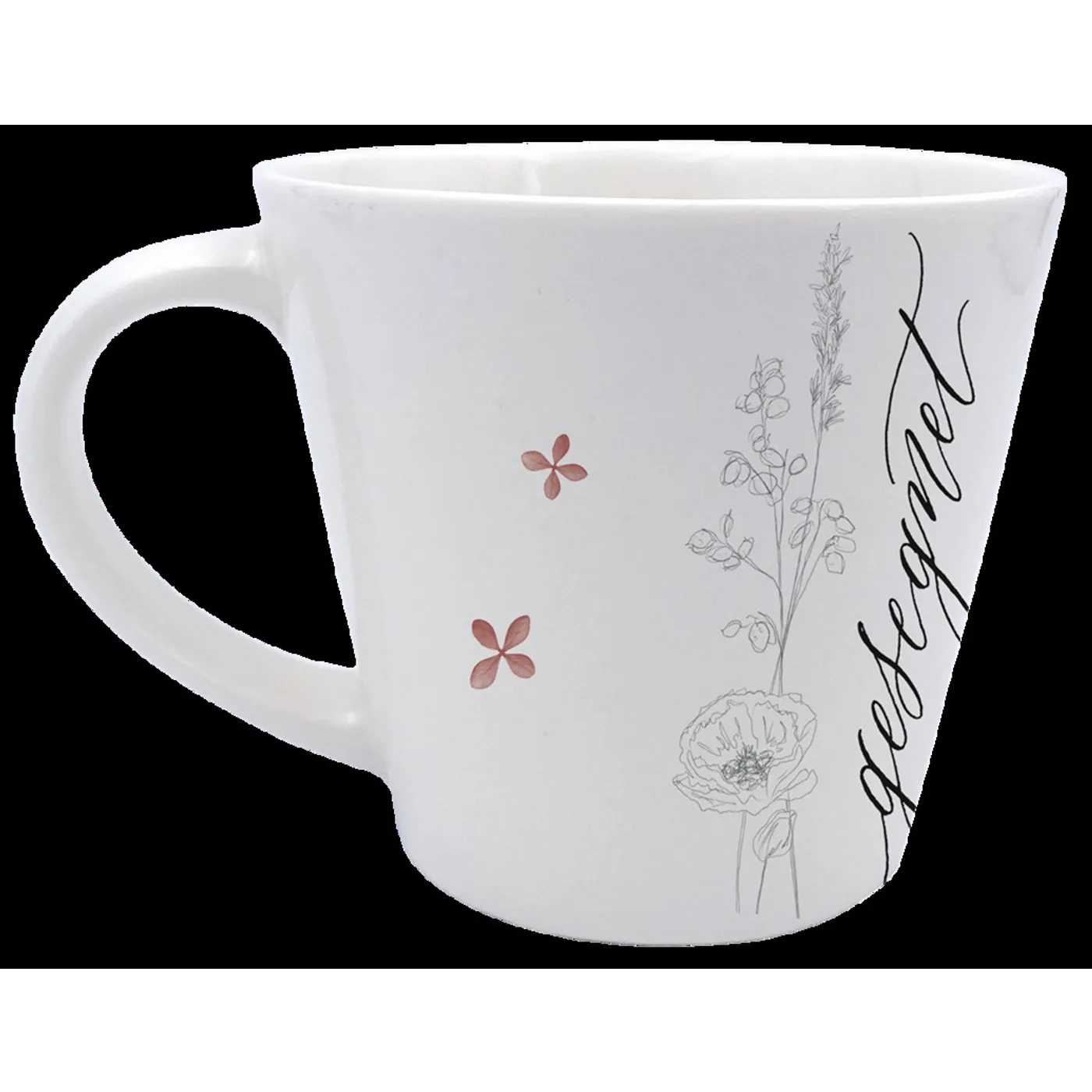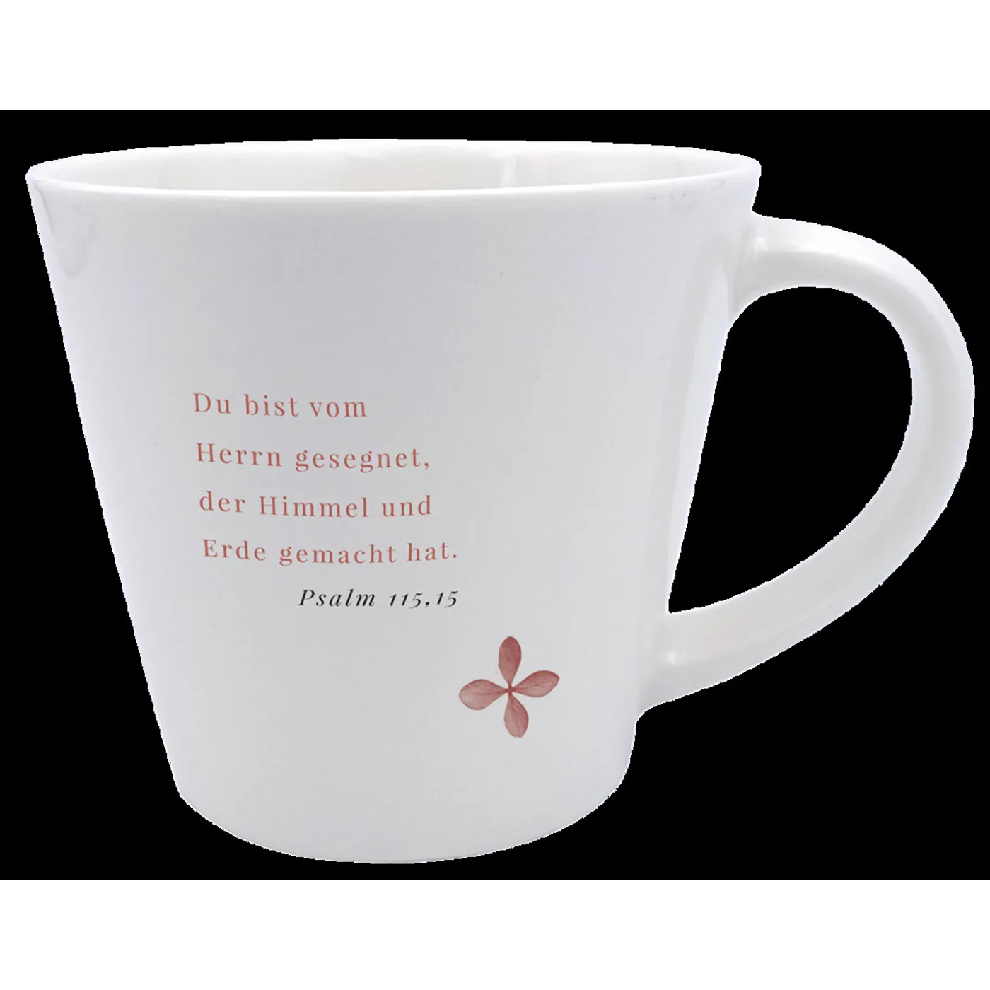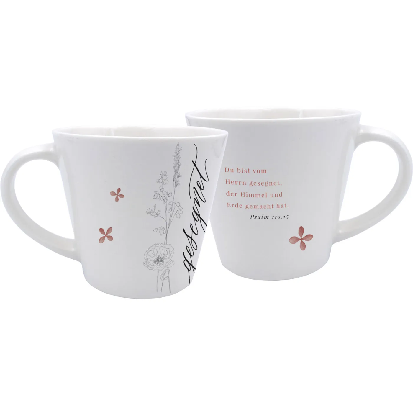 Die elegant gestaltete Tasse macht jede Kaffeepause zum Vergnügen. Mit dem kalligrafierten Wort »gesegnet«, einer zarten Bleistiftzeichnung und der Zusage aus Psalm 115,15: »Du bist vom Herrn gesegnet, der Himmel und Erde gemacht hat.«