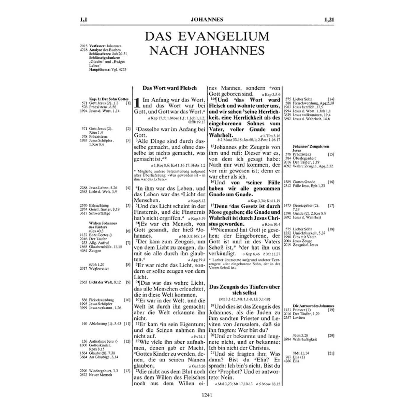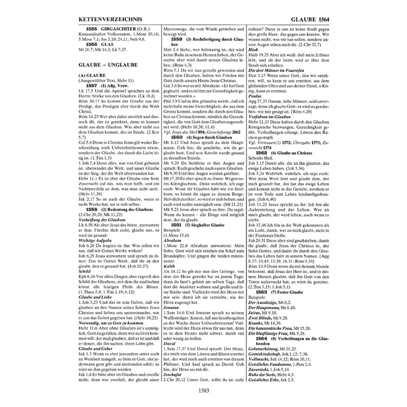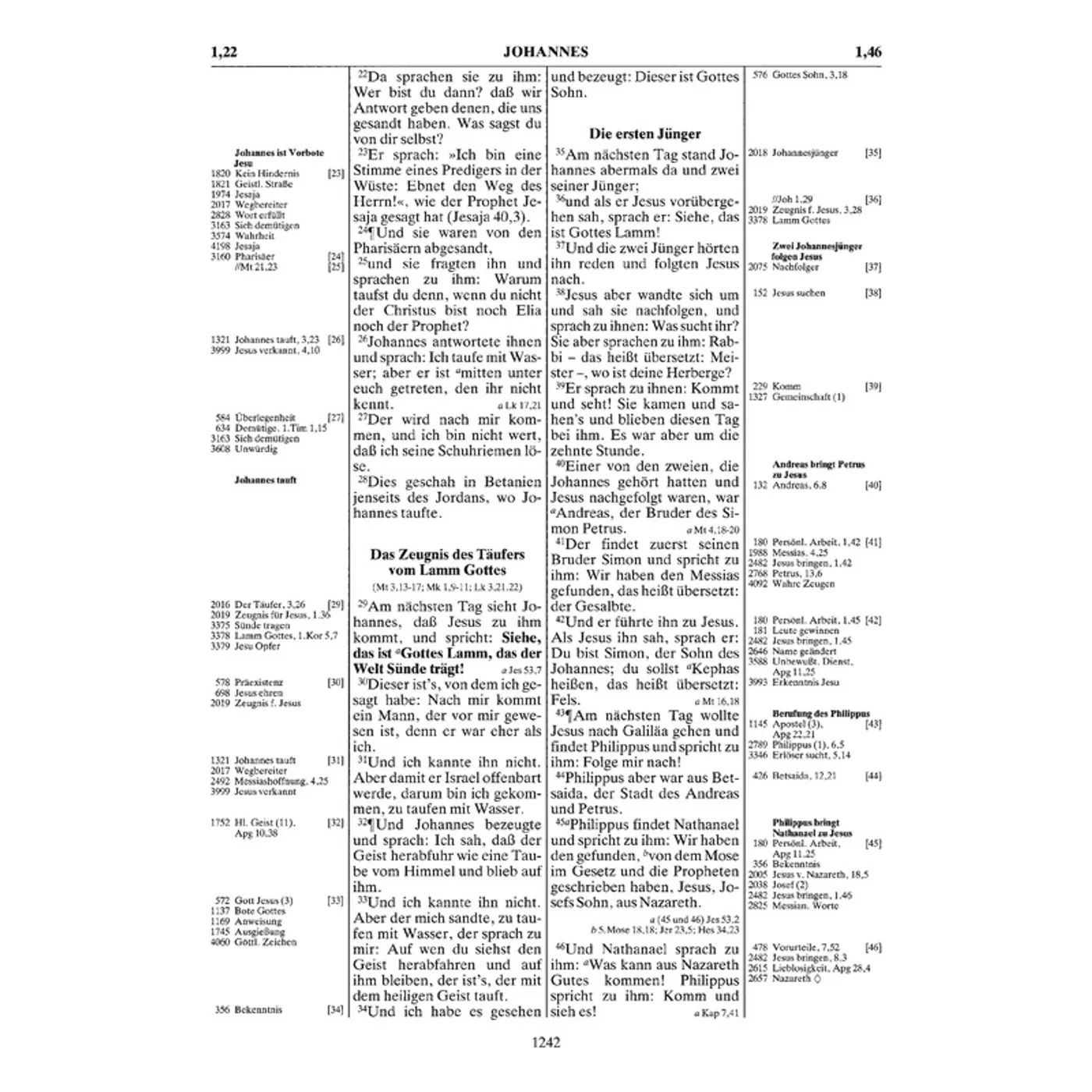 Das Besondere der Thompson-Studienbibel ist ihr einzigartiges Konzept: Keine Erläuterungen eines Herausgebers, sondern die thematisch zusammengehörenden Bibelstellen werden durch ein Nummern-Verweissystem miteinander verbunden. Der Leser wird – wie an einem roten Faden – themenweise durch die Heilige Schrift geführt.