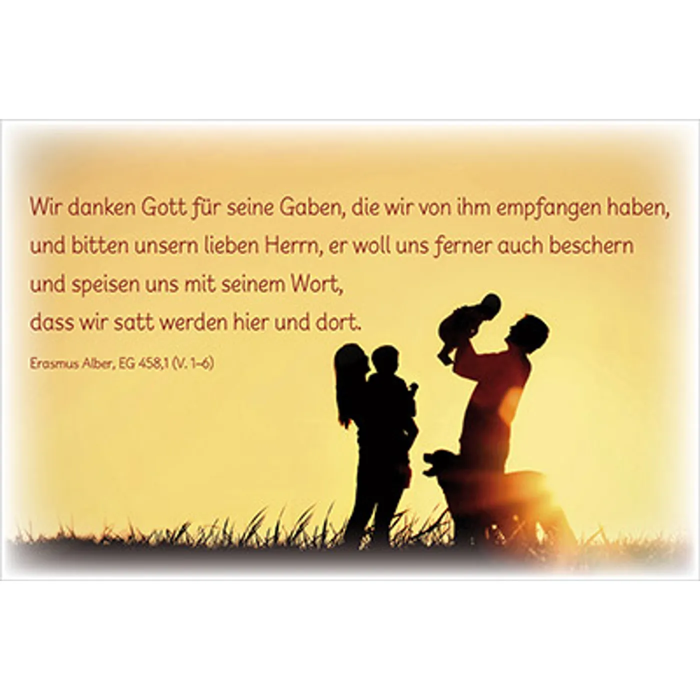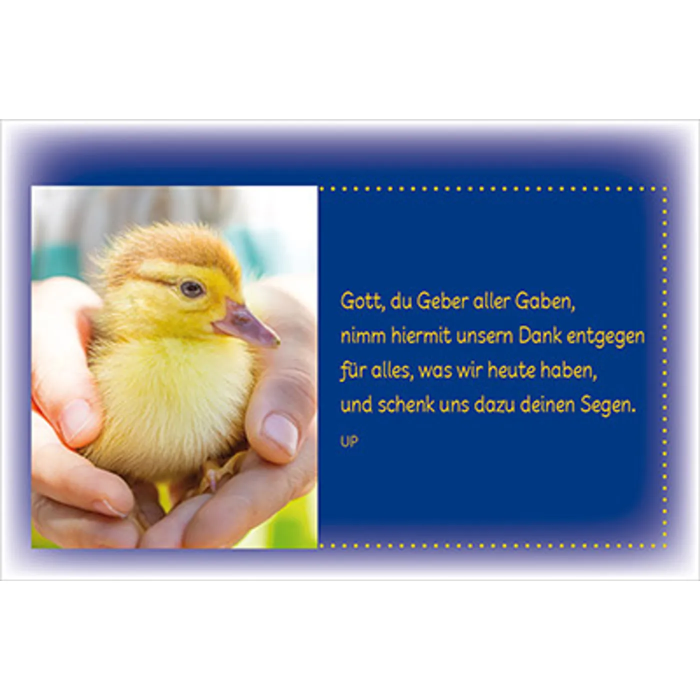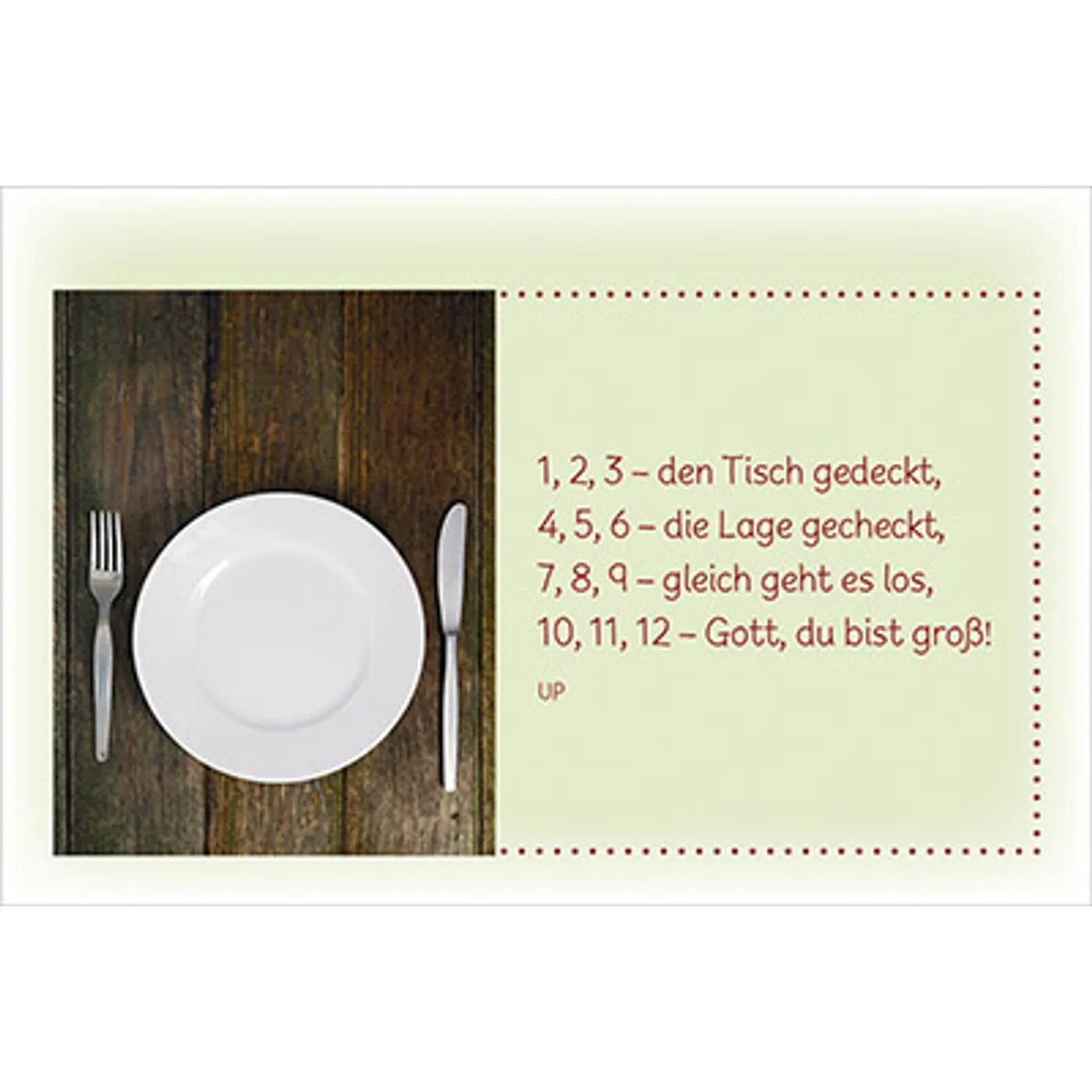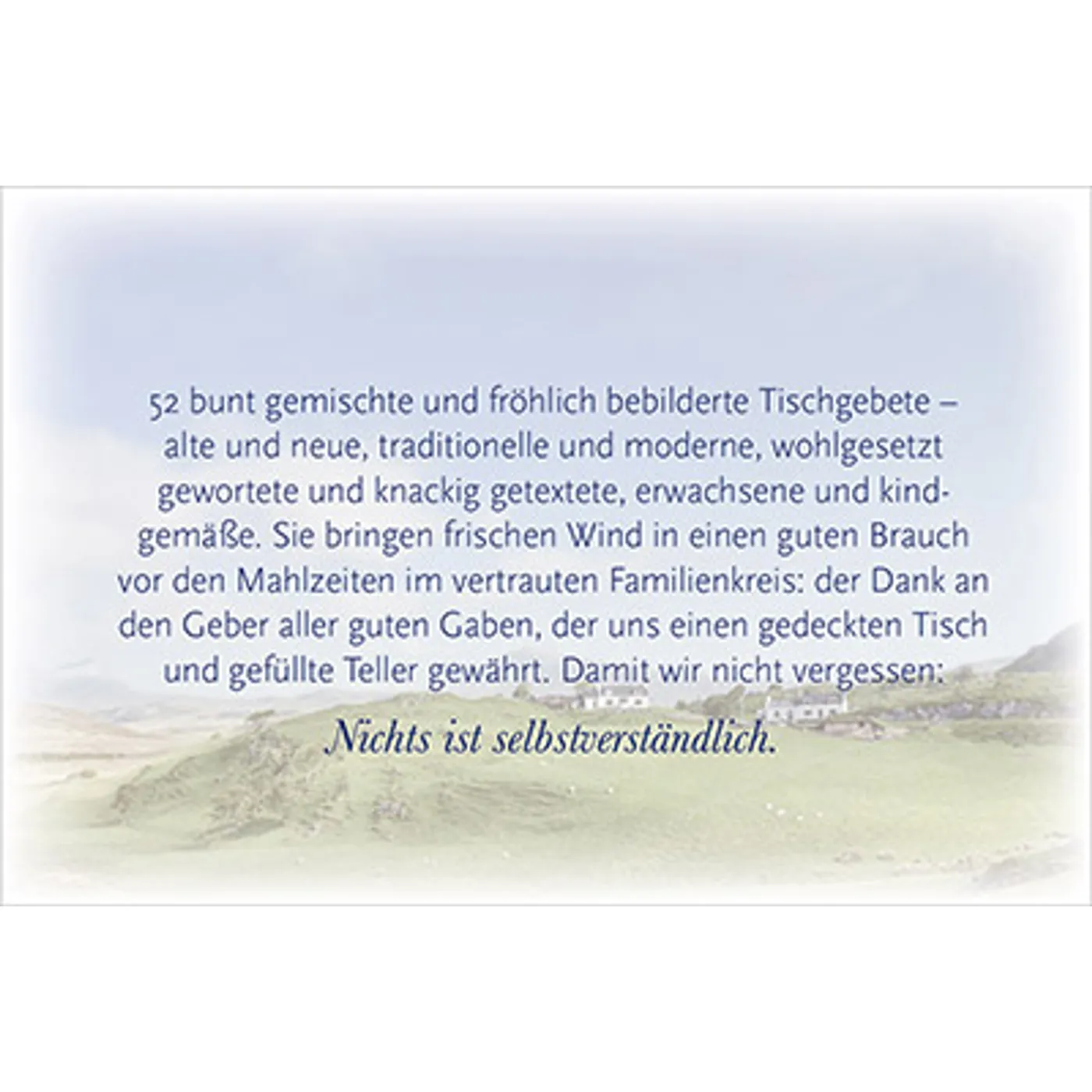 52 bunt gemischte und fröhlich bebilderte Tischgebete – alte und neue, traditionelle und moderne, wohlgesetzt gewortete und knackig getextete, erwachsene und kindgemäße. Sie bringen frischen Wind in einen guten Brauch vor den Mahlzeiten im vertrauten Familienkreis: der Dank an den Geber aller guten Gaben, der uns einen gedeckten Tisch und gefüllte Teller gewährt. Damit wir nicht vergessen: Nichts ist selbstverständlich.