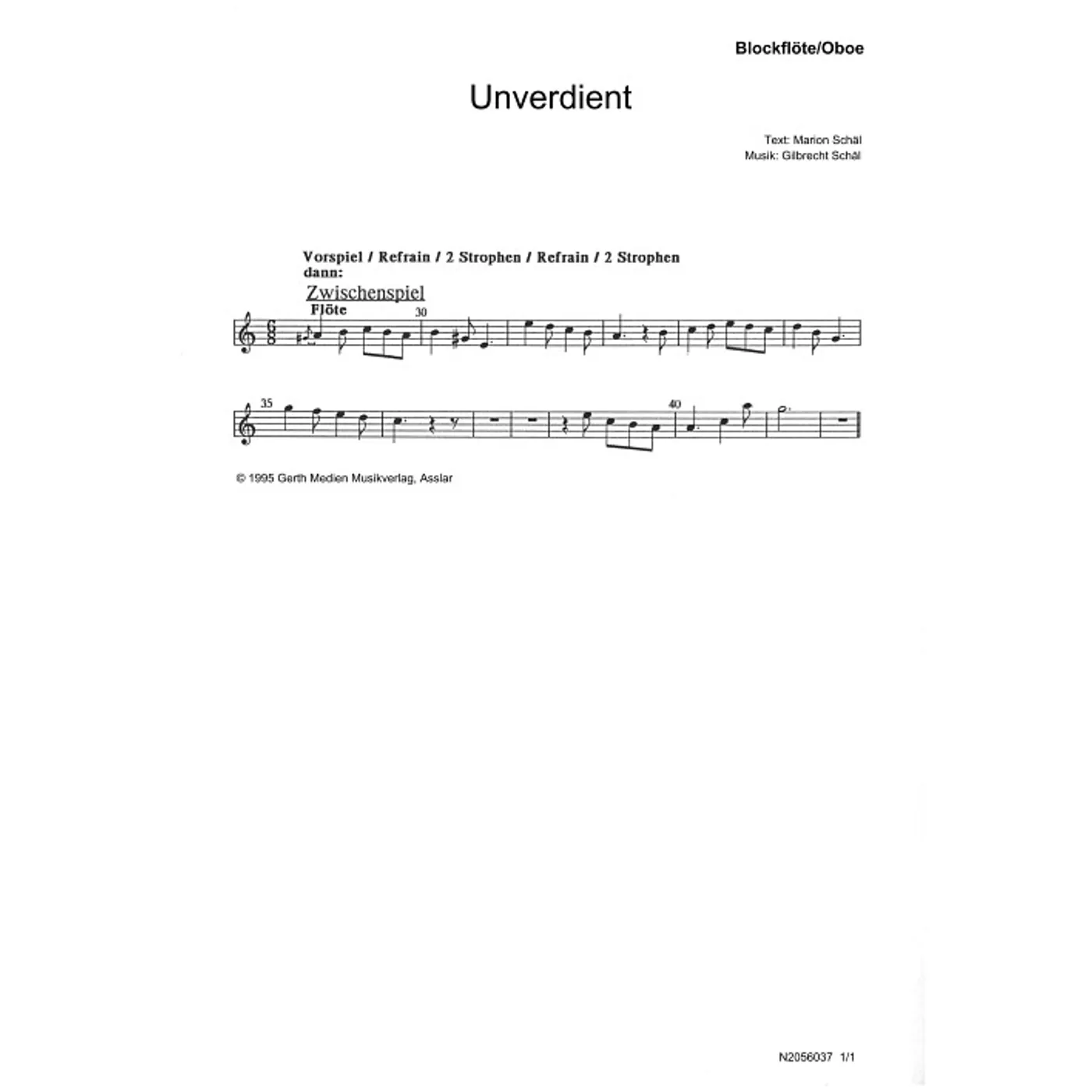 Unverdient (Blockflöte / Oboe) (diese Variante haben Sie gerade ausgewählt) (traditionell, Orchestereinzelstimme) Gilbrecht Schäl (Komposition) |