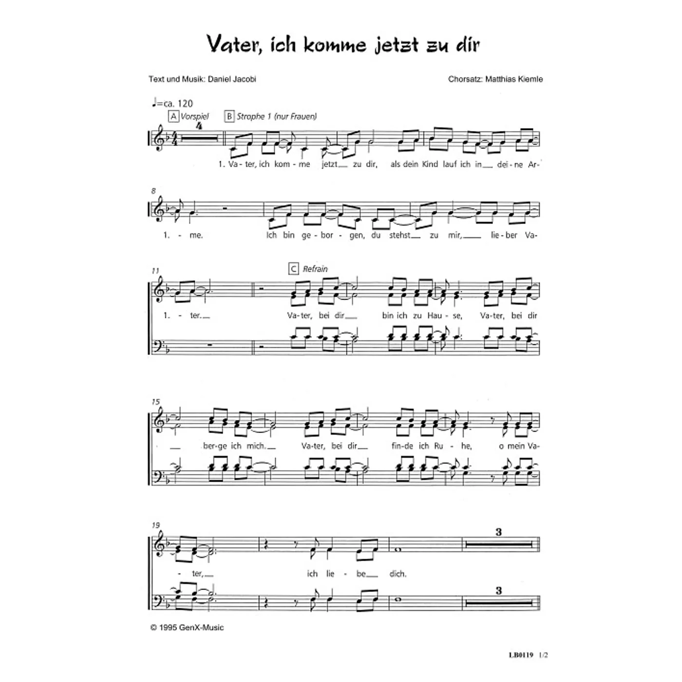 Vater, ich komme jetzt zu dir (diese Variante haben Sie gerade ausgewählt) (modern, gemischter Chor, mit Akkorden, vierstimmig, F-Dur) Daniel Jacobi (Komposition, Text), Matthias Kiemle (Bearbeiter) |