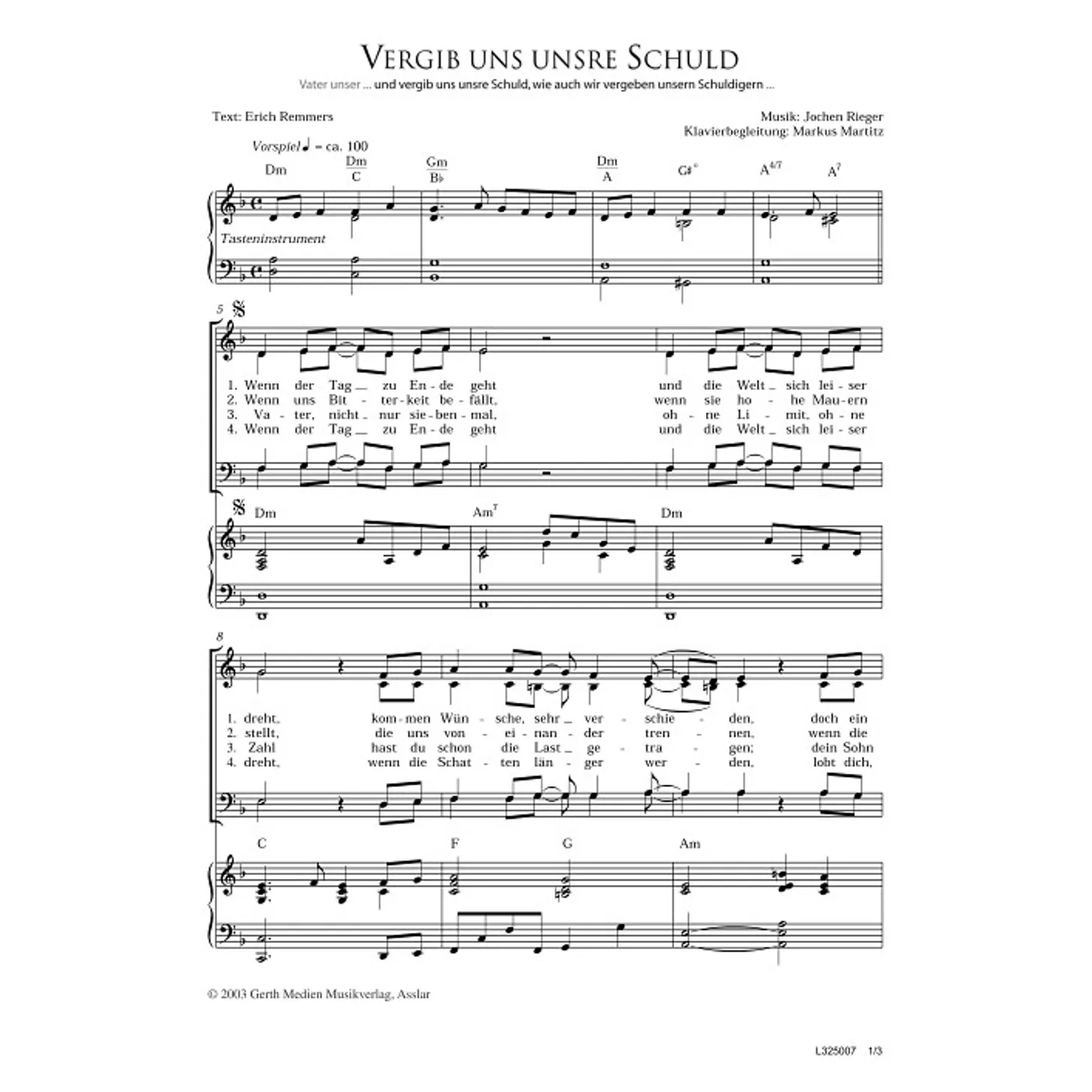 Vergib uns unsre Schuld (diese Variante haben Sie gerade ausgewählt) (modern, Klavier, gemischter Chor, mit Akkorden, vierstimmig, D-Moll) Erich Remmers (Text), Markus Martitz (Bearbeiter), Jochen Rieger (Komposition, Bearbeiter) |