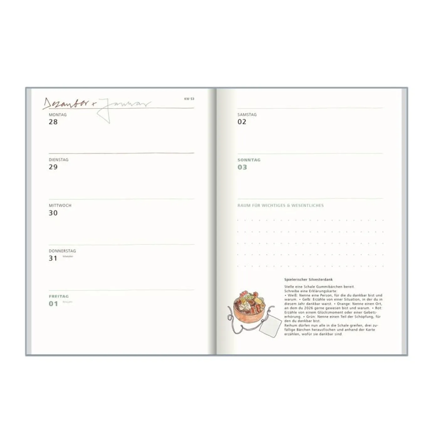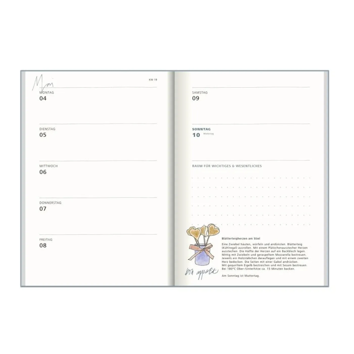 Viele hilfreiche Listen (Wunschliste, Verliehenes, Bucket List) und praktische Übersichten (Gemüsekalender, Ferientermine, Jahresübersicht) helfen im Alltag den Überblick zu behalten. Zur besonderen Ausstattung gehören auch das warmweiße, nachhaltige FSC-Papier aus verantwortungsvollen Quellen und ein praktisches Lesebändchen. Mit dem Gummiband können Seiten markiert werden oder kleine Zettel sicher im Kalender verwahr werden. Der feste Einband sorgt für Schutz und Stabilität und hat eine angenehme Softtouch-Oberfläche mit Handschmeichlergefühl.