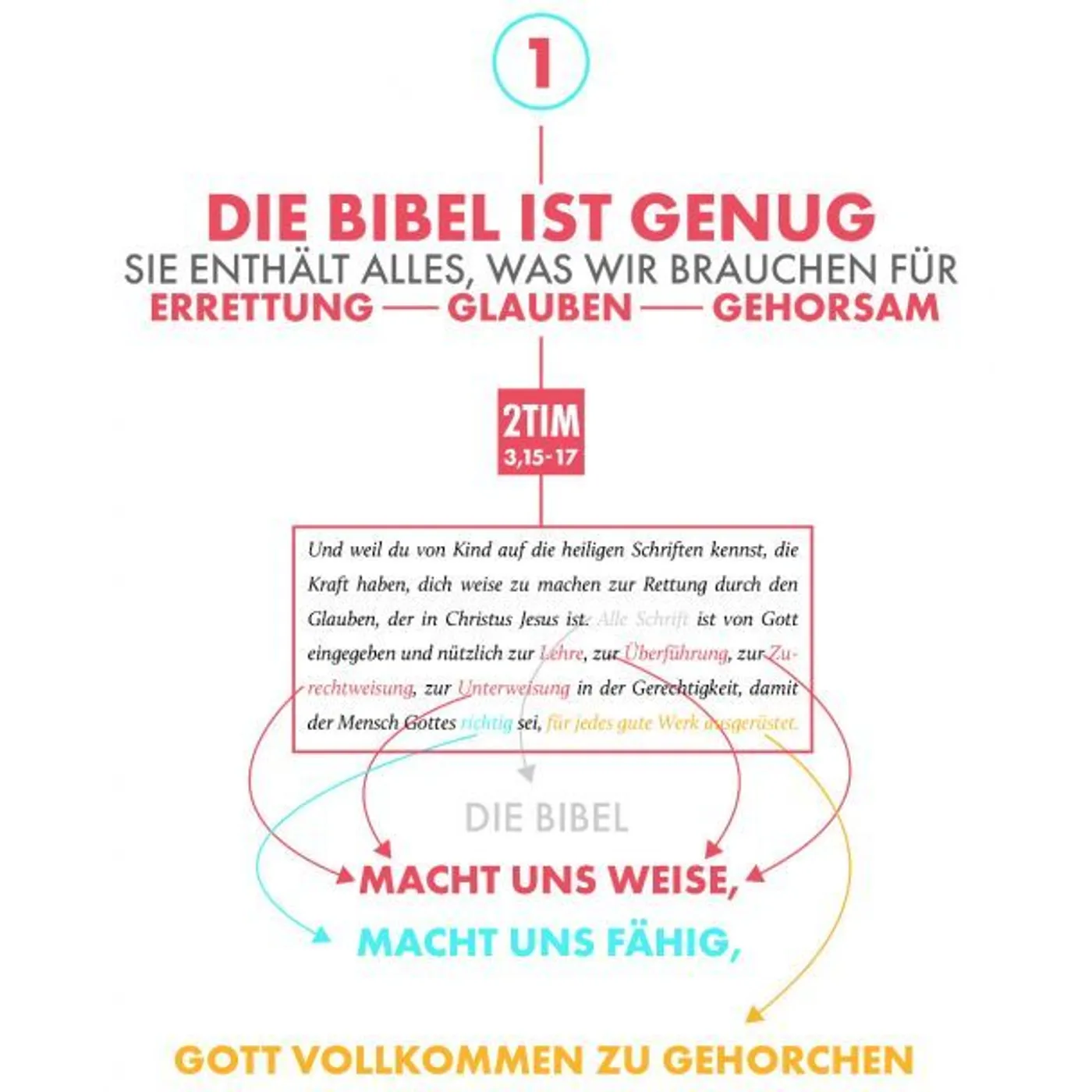 Die drei Teile tragen dazu bei, sich mit der Bibel vertraut zu machen und laden zum Studium von Gottes Wort ein. Zudem wird ein Streifzug durch die Bibel vermittelt, der kompakt, illuster und aufschlussreich ist. Hervorzuheben ist dabei die Klarheit der Texte. Anstatt seitenweise Erläuterung und Erklärungen zu präsentieren, hat sich das Autorenduo für kurze und knackige Texte entschieden, die durch die kreativen Illustrationen unterstützt werden.