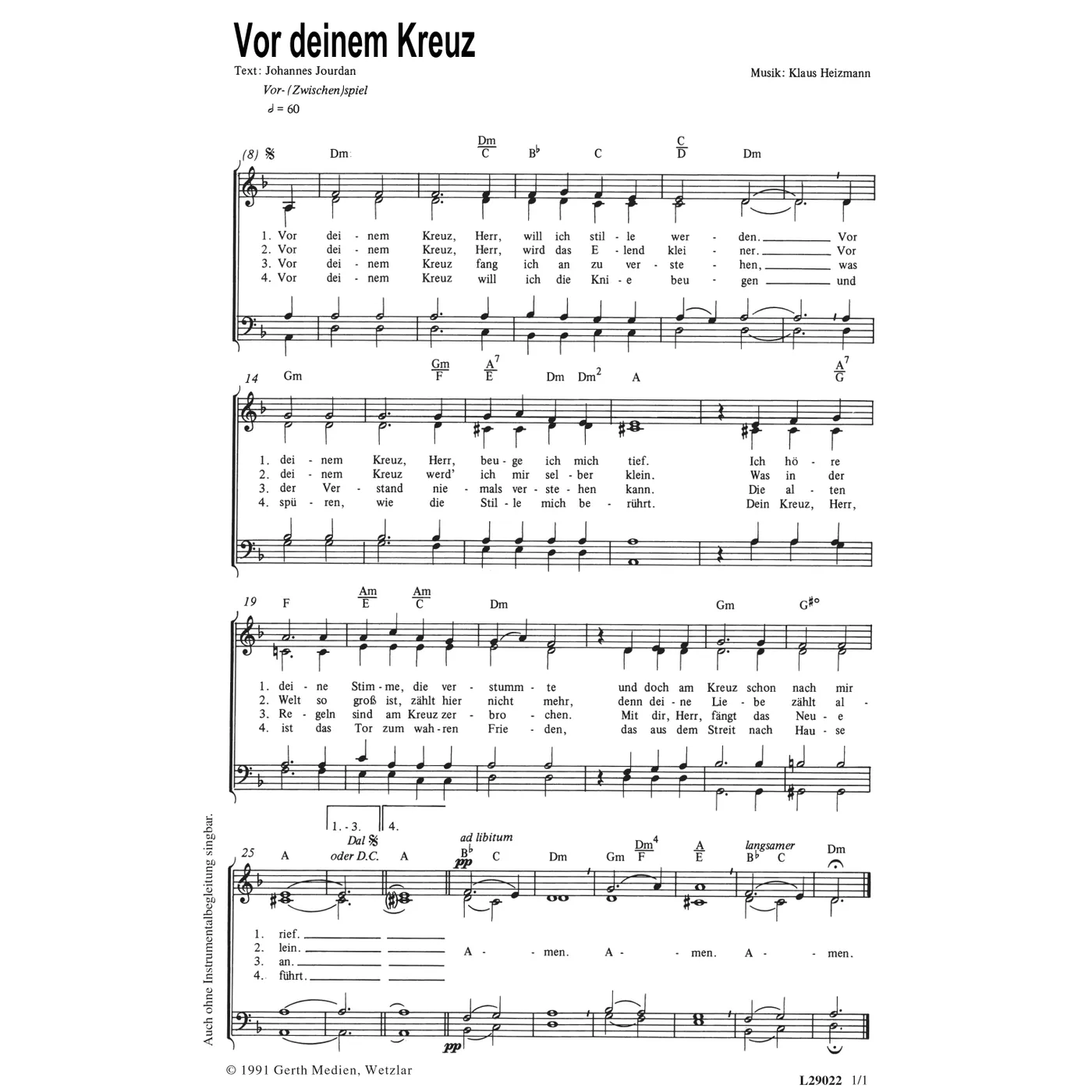 Vor deinem Kreuz (Neuere Gemeindelieder, Klavier, gemischter Chor, vierstimmig, D-Moll) Klaus Heizmann (Klaviersatz, Chorsatz, Melodie), Johannes Jourdan (Text) | Neuere Gemeindelieder, Klavier, gemischter Chor, vierstimmig, D-Moll | 2,80 € |