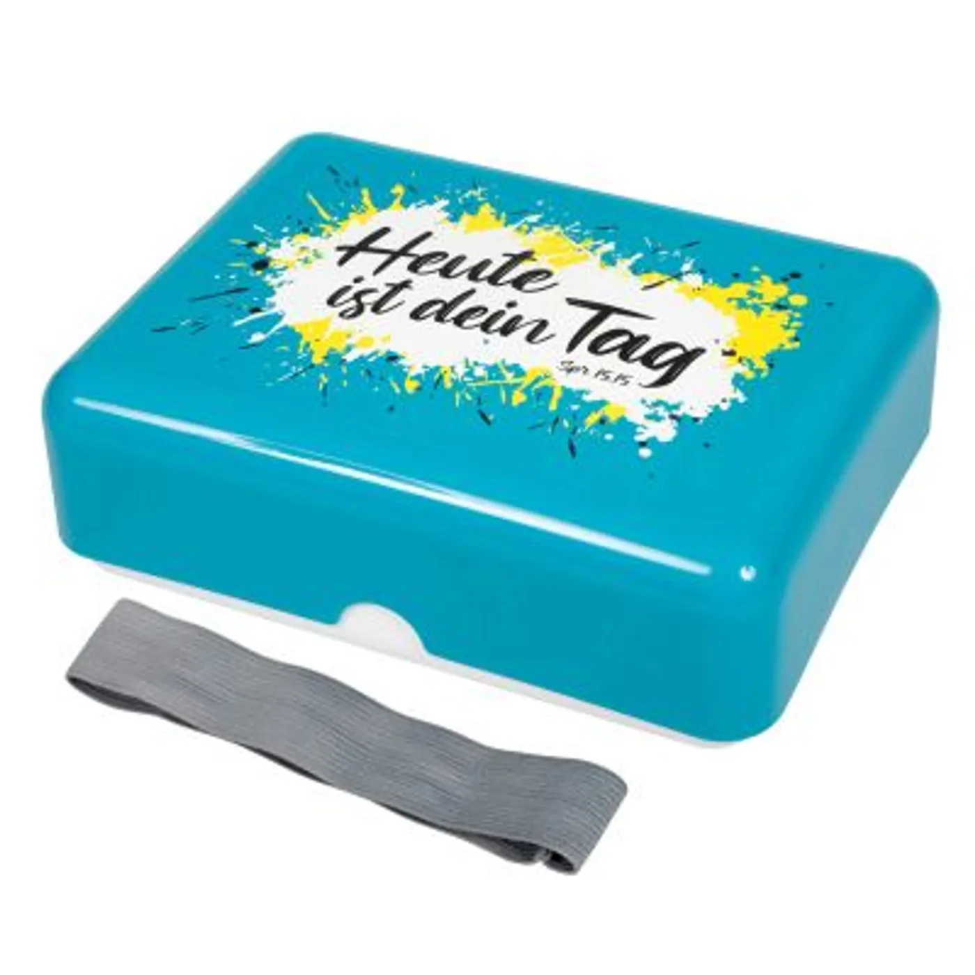 Immer dabei: Praktische Pausenbox für jedes Alter, Oberteil türkisfarben, Unterteil weiß, mit grauem Elastikband (30 x 2,5 cm). Veredelt ist die Dose mit dem Vers „Heute ist dein Tag Spr 15,15“, grafisch modern umgesetzt im UV-Digitaldruck.