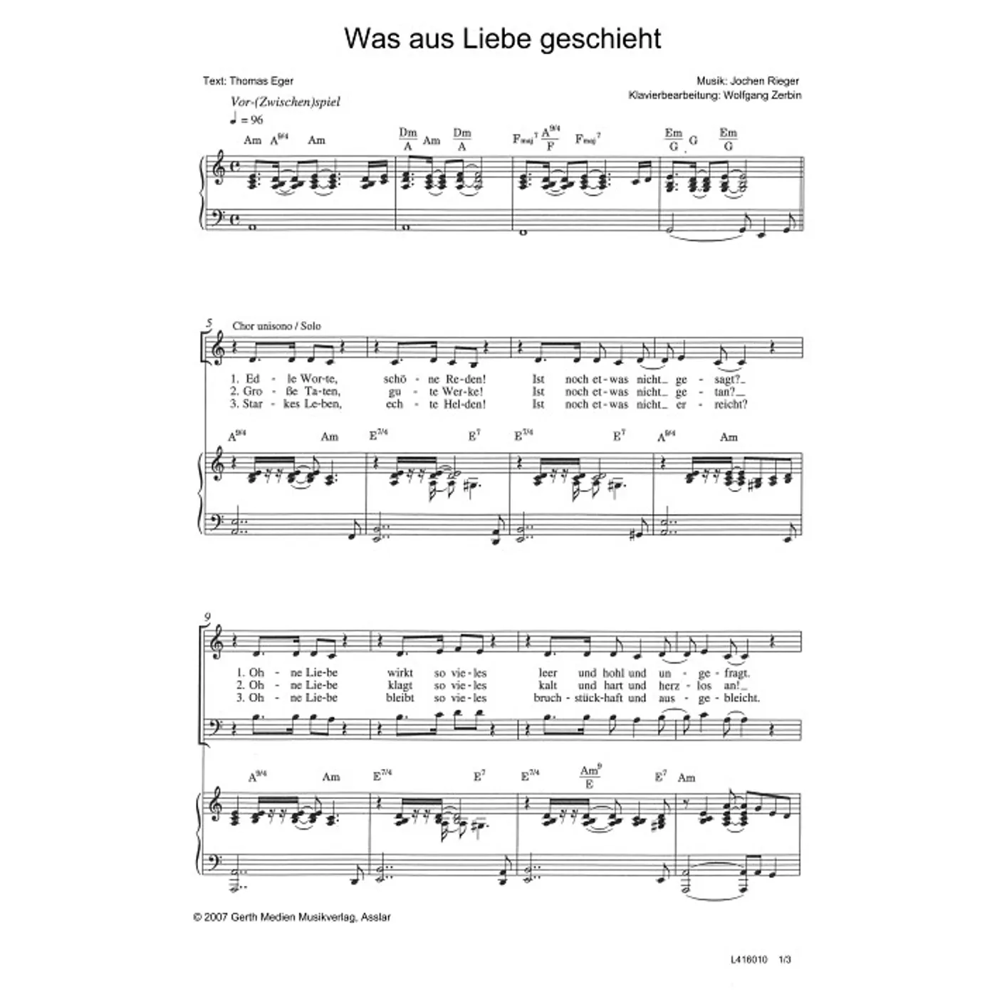 Was aus Liebe geschieht (modern, Backings, gemischter Chor, mit Akkorden, vierstimmig, a-moll-Moll) Thomas Eger (Text), Jochen Rieger (Komposition) | modern, Backings, gemischter Chor, mit Akkorden, vierstimmig, a-moll-Moll | 1,50 € |