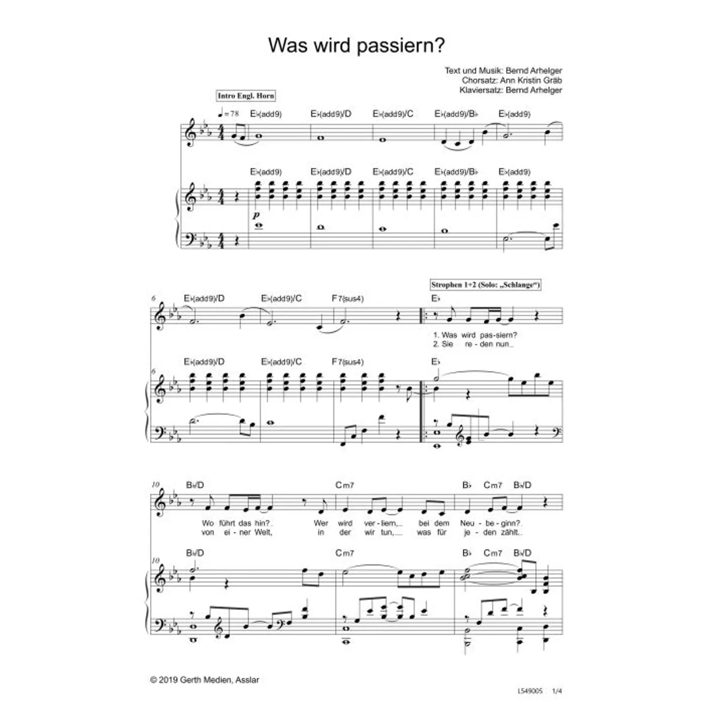 Was wird passiern (Kinderchor, mit Akkorden, zweistimmig, Es-Dur, gleiche Reihe) Bernd Arhelger (Komposition, Text), Anni Gräb (Chorsatz) | Kinderchor, mit Akkorden, zweistimmig, Es-Dur, gleiche Reihe | 1,50 € |