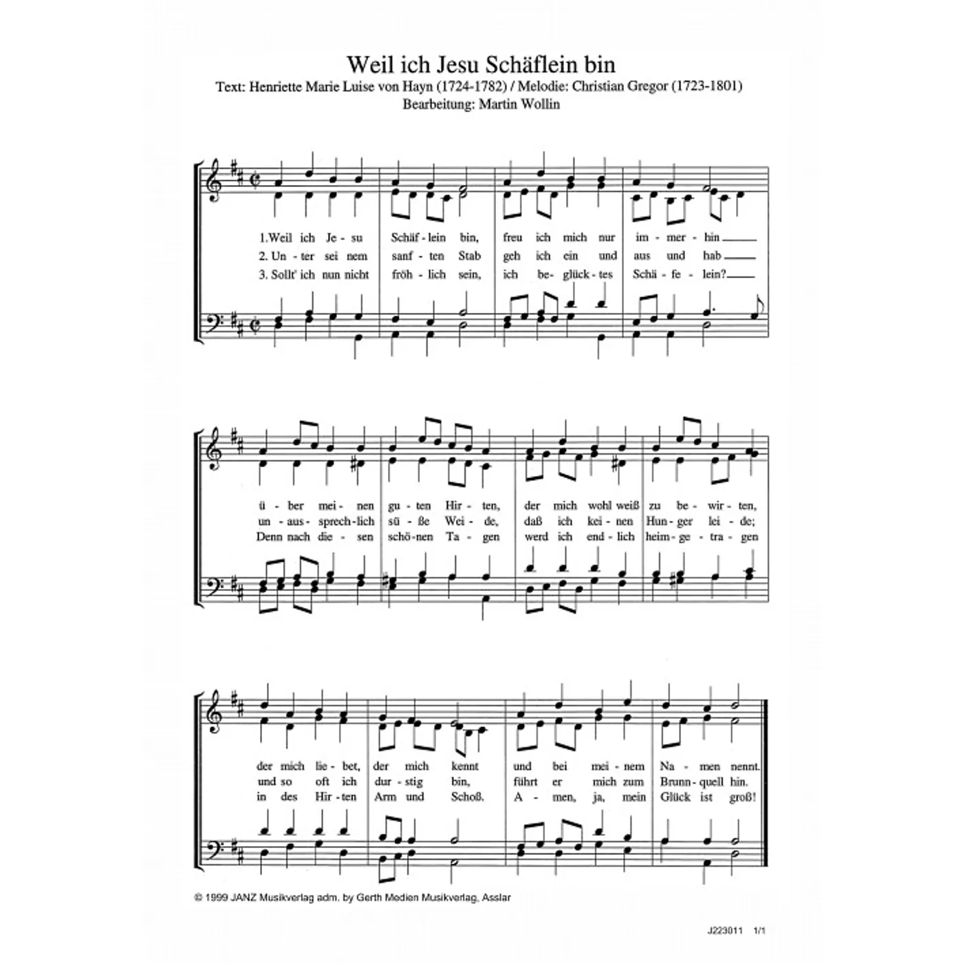Weil ich Jesu Schäflein bin (diese Variante haben Sie gerade ausgewählt) (traditionell, gemischter Chor, vierstimmig) Christian Gregor (Komposition), Henriette Luise von Hayn (Text), Martin Wollin (Chorsatz) |