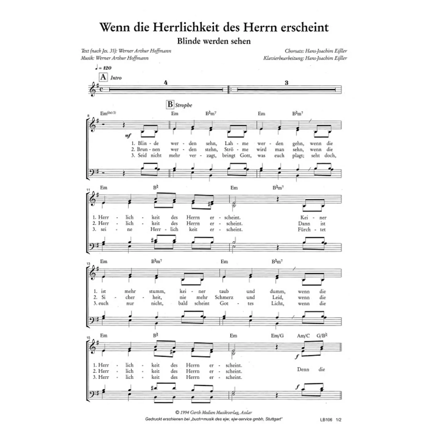 Wenn die Herrlichkeit des Herrn erscheint (diese Variante haben Sie gerade ausgewählt) (modern, gemischter Chor, mit Akkorden, vierstimmig, E-Moll) Werner A. Hoffmann (Komposition, Text), Hans-Joachim Eißler (Bearbeiter) |