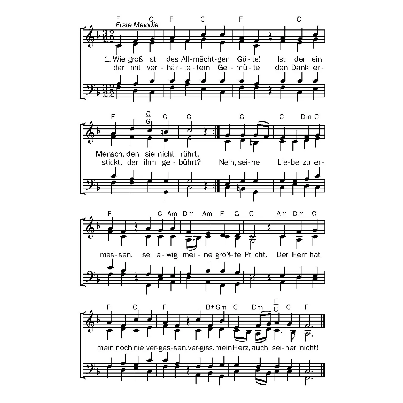 Wie groß ist des Allmächtgen Güte (diese Variante haben Sie gerade ausgewählt) (Choräle & Heilslieder, gemischter Chor, vierstimmig, F-Dur, Largo (58), Halbe) Christian Fürchtegott Gellert (Text), Halle 1704 (Melodie), Neumünster 1931 (Satz) |