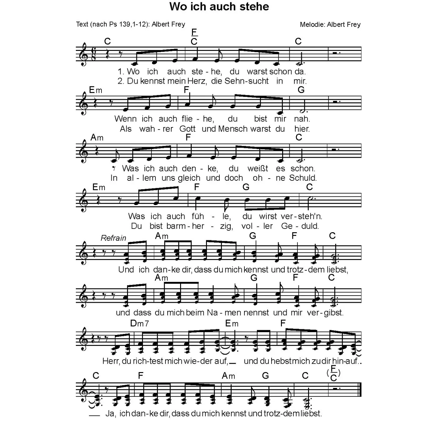 Wo ich auch stehe (diese Variante haben Sie gerade ausgewählt) (Worship, dreistimmig, C-Dur, Larghetto (64), Punkt. Viertel) Albert Frey (Text, Melodie) |