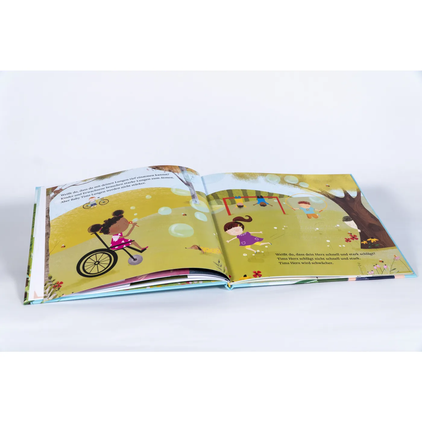 Das Buch begleitet Sam dann auf eine Fantasiereise, bei der er sich vorstellt, was sein Bruder im Himmel erleben könnte. Die Sprache ist sehr einfühlsam und kindgerecht, ohne etwas zu beschönigen oder zu überfordernd zu sein. Am Anfang des Buches ist auch sehr schön erklärt, was mit dem kleinen Tim los ist. Sätze wie z.B. „Tims Herz schlägt nicht schnell und stark. Tims Herz wird schwächer.“, lassen es viel greifbarer werden und lassen besser verstehen, was mit dem kleinen Tim passiert.