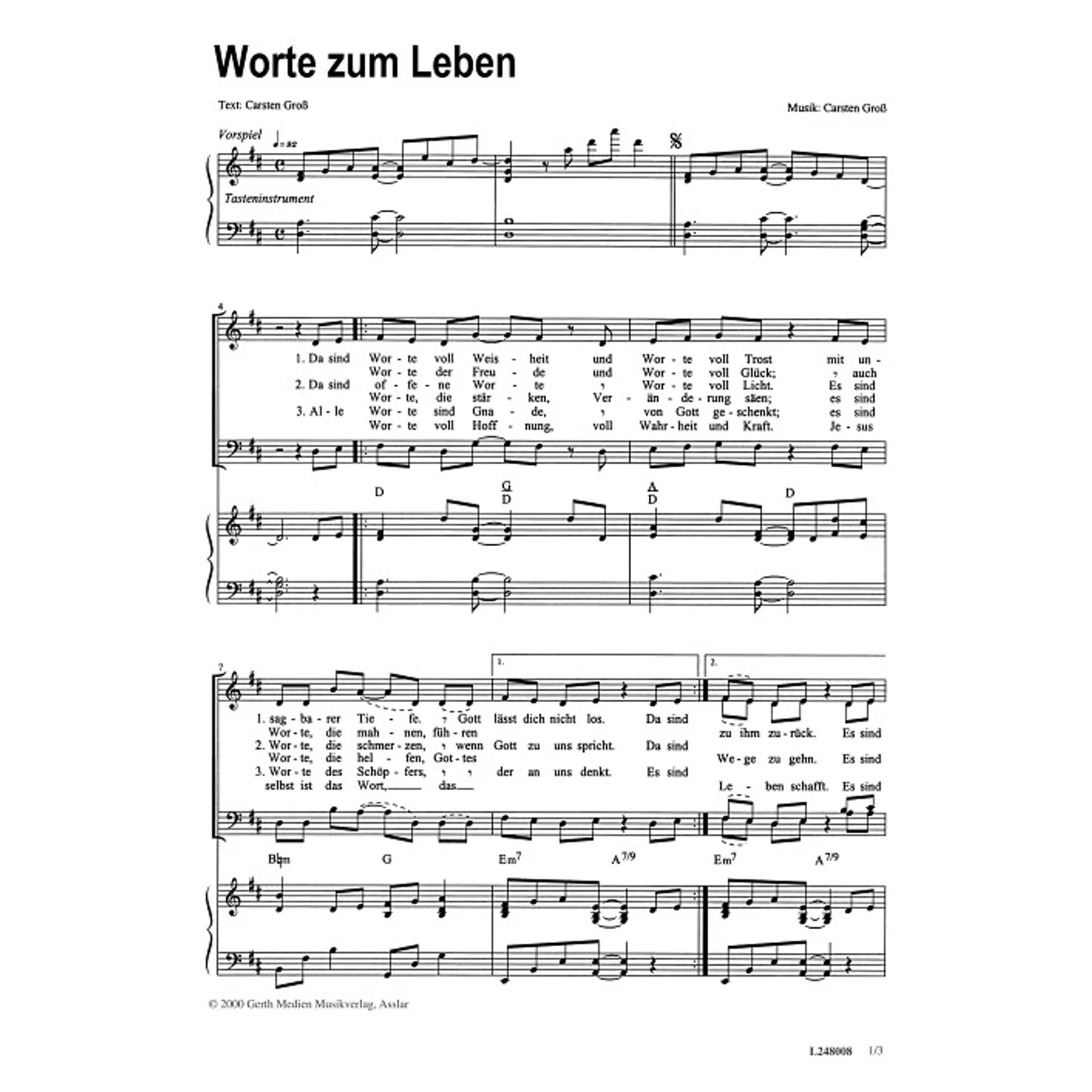 Worte zum Leben (modern, gemischter Chor, mit Akkorden, vierstimmig, D-Dur) Carsten Groß (Komposition, Text) | modern, gemischter Chor, mit Akkorden, vierstimmig, D-Dur | 1,50 € |