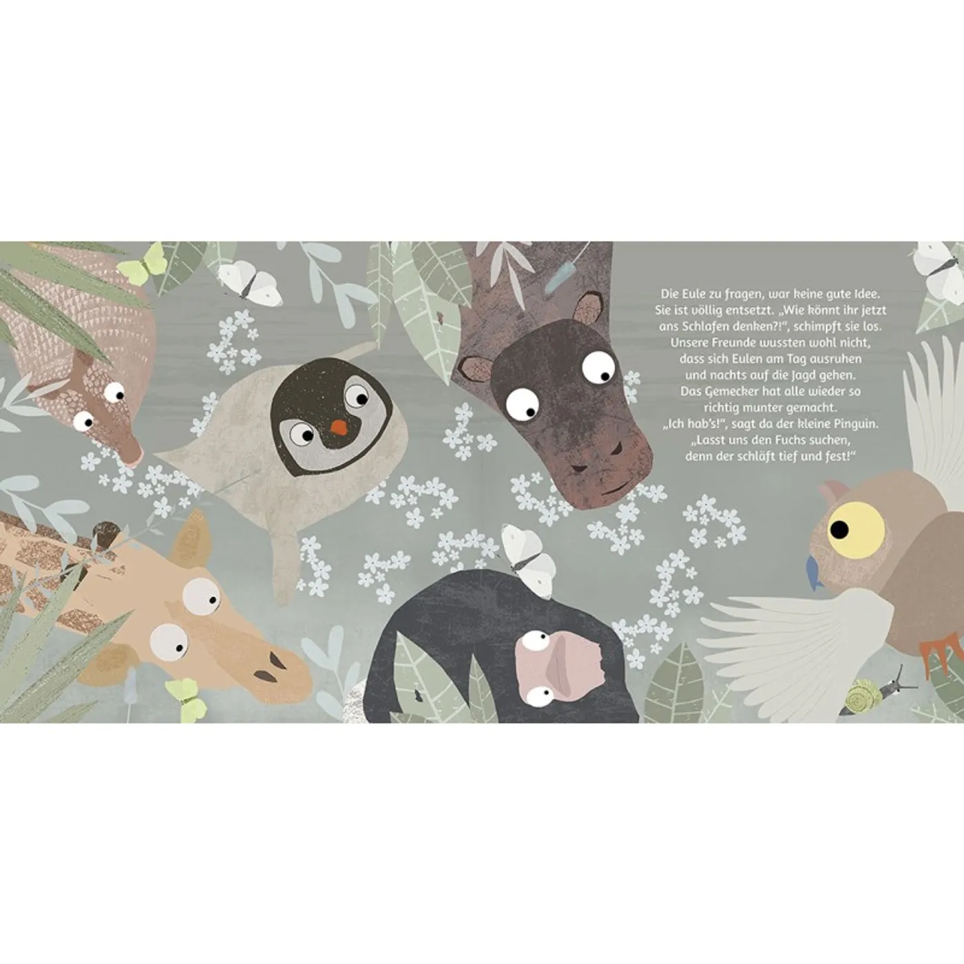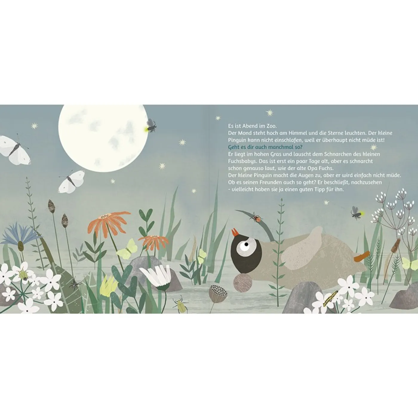 Der - von vielen Kindern heiß geliebte - kleine Pinguin kann nicht einschlafen. Er ist ja auch noch gar nicht müde! Die kleinen Fuchskinder schlafen schon, doch der kleine Pinguin kann einfach nicht einschlafen. Da beschließt er seine Freunde zu fragen. Ob das Nilpferd oder die Giraffen ihm helfen können? Vielleicht weiß ja auch die Eule einen Rat…