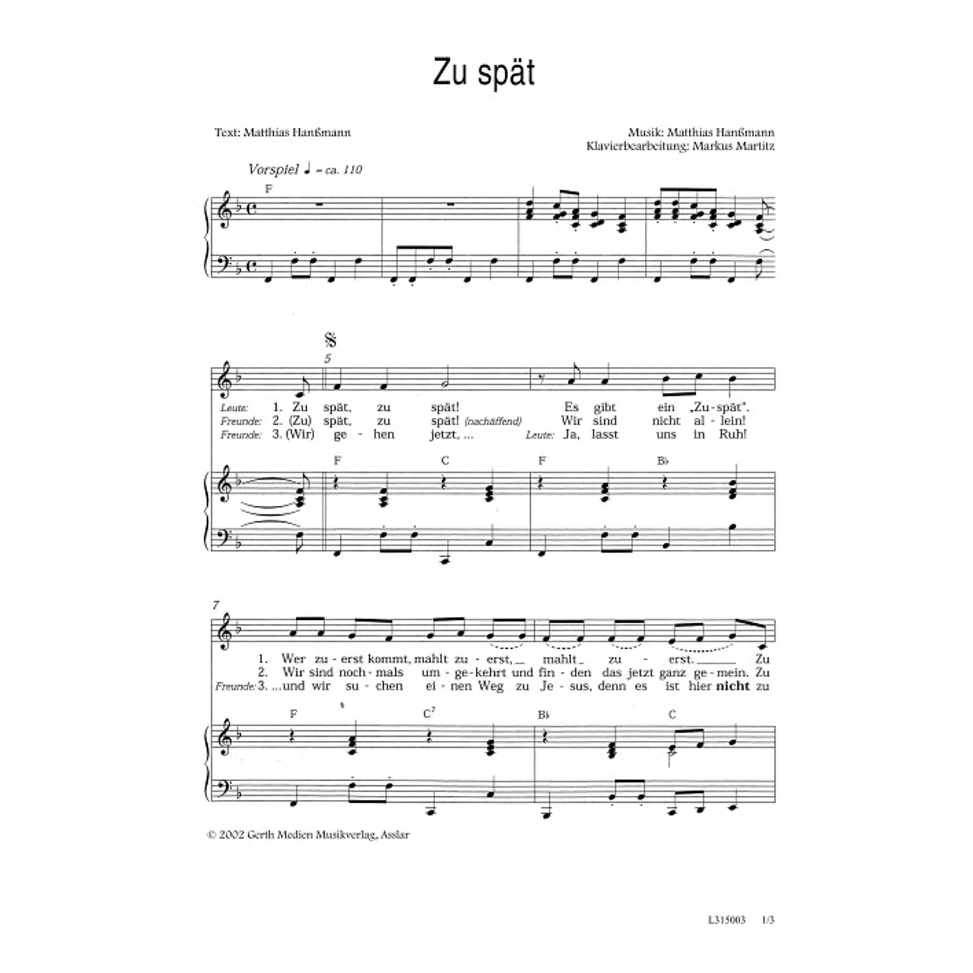 Zu spät (diese Variante haben Sie gerade ausgewählt) (modern, Kinderchor, Klavier, einstimmig, mit Akkorden, F-Dur) Matthias Hanßmann (Komposition, Text), Markus Martitz (Bearbeiter) |