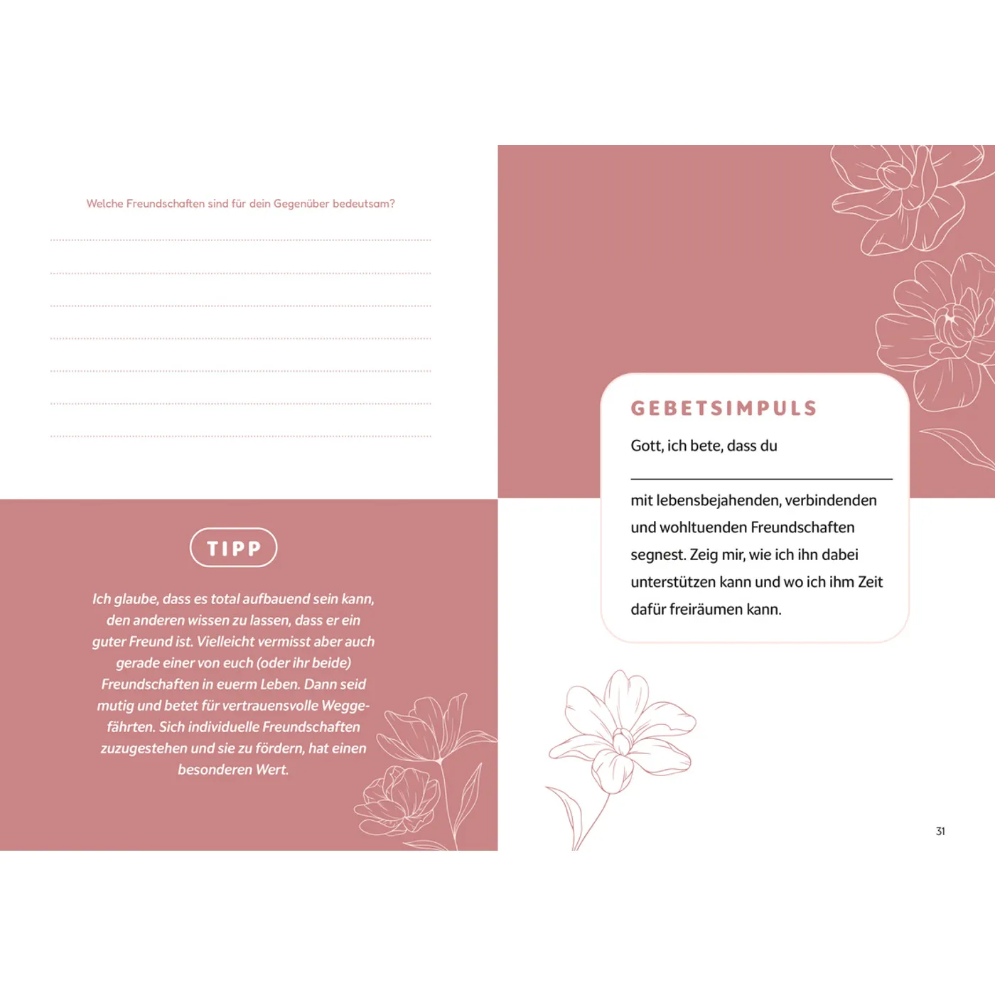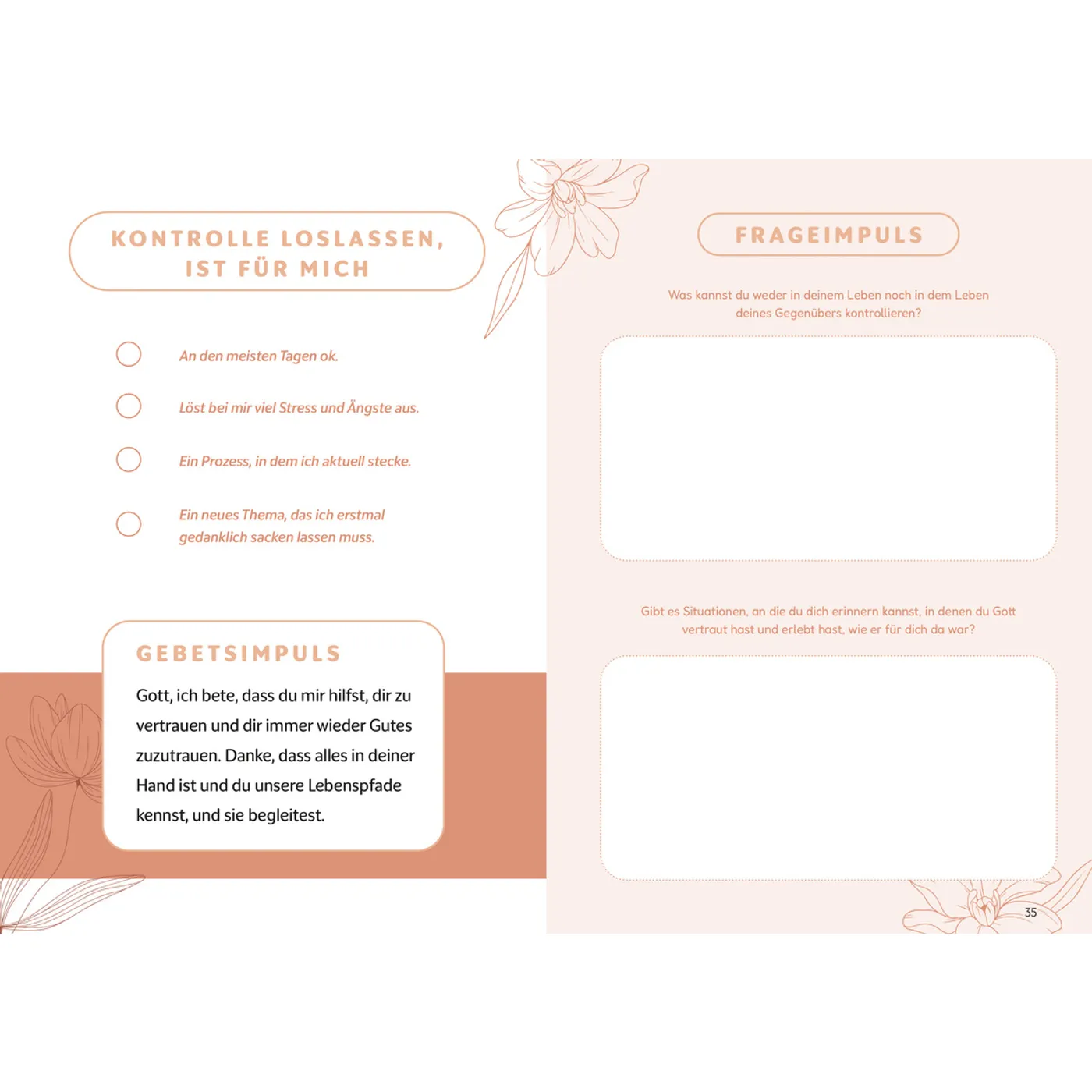 Jede Menge Impulse, die ich sehr gut in den Alltag integrieren kann! Fundierte thematische und auch persönliche Inputs mit anschließenden Gebets- und Frageimpulsen mit Platz zum Schreiben, ich liebs! Egal ob Christ*in oder nicht, hier kann jede*r was mitnehmen. Muss man auch nicht von vorne bis hinten durchgehen, je nach Interesse. Die perfekte Ergänzung zum ersten Buch „Jeden Tag ein neues Ja“.